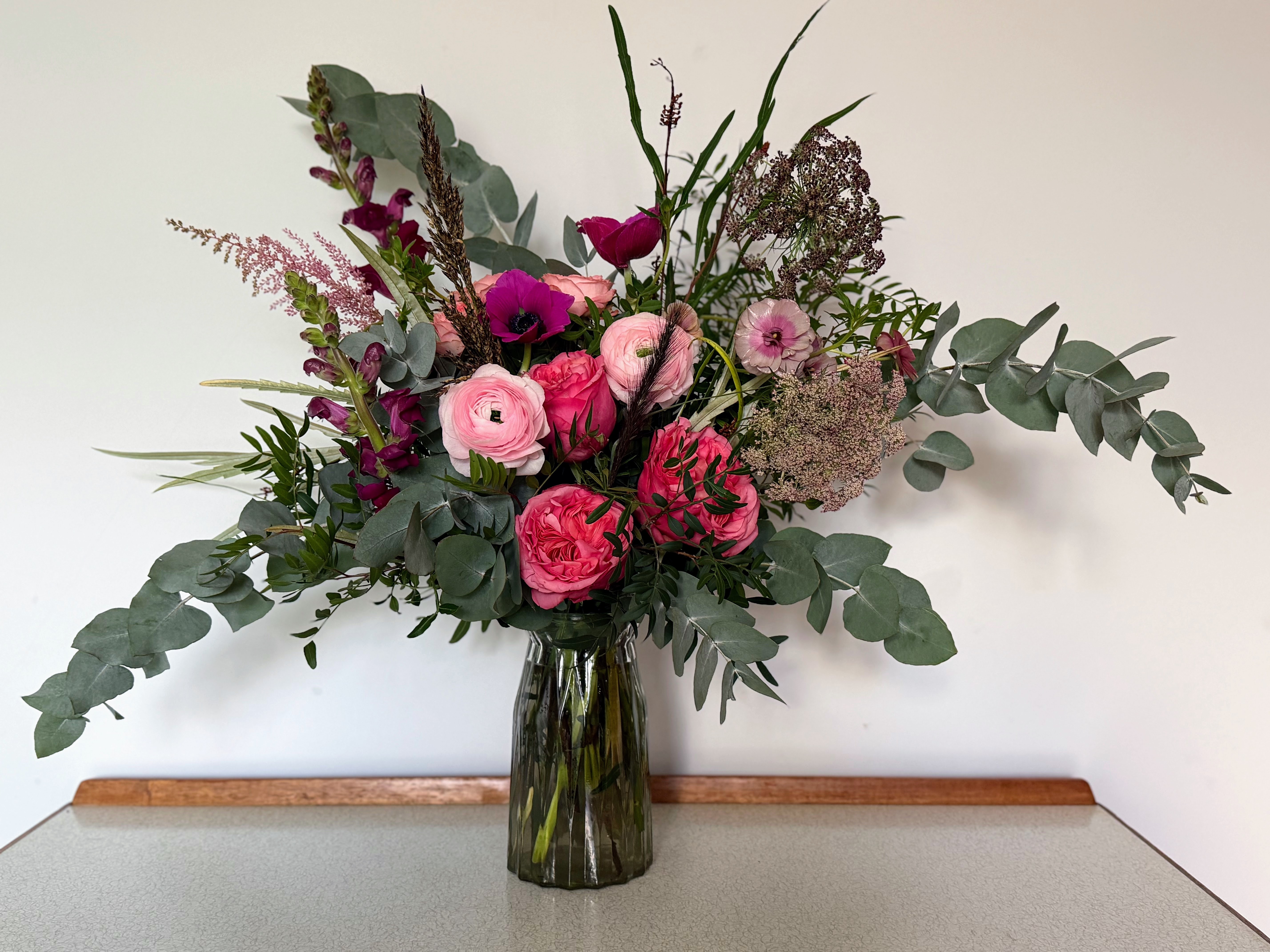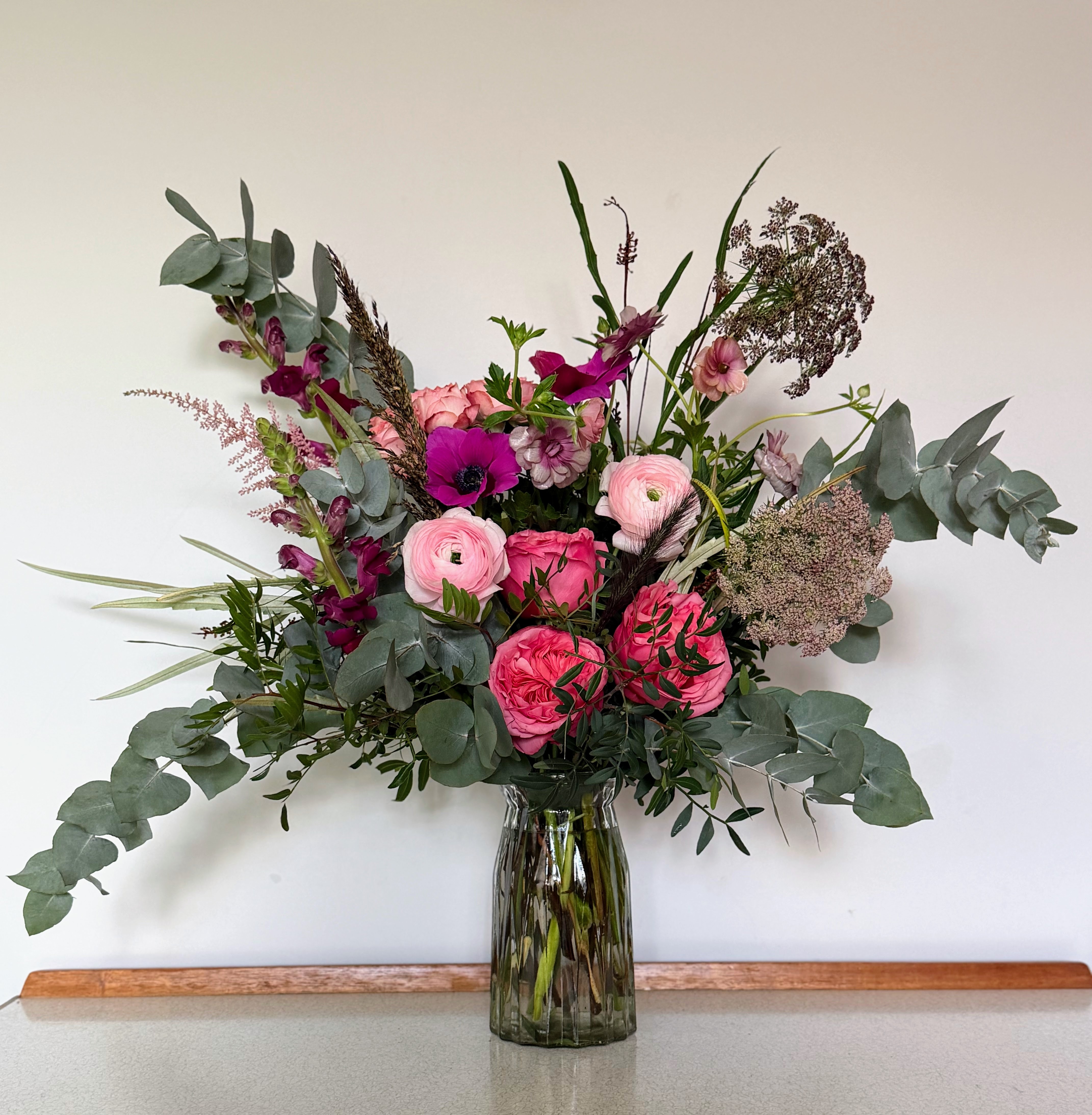 The Grand Love is our most generous bouquet, created for moments that call for something truly impactful. Featuring an abundant mix of romantic roses, ranunculus, anemone and seasonal textural stems, finished with flowing eucalyptus and natural foliage, it's arranged in a loose, modern style with real presence.