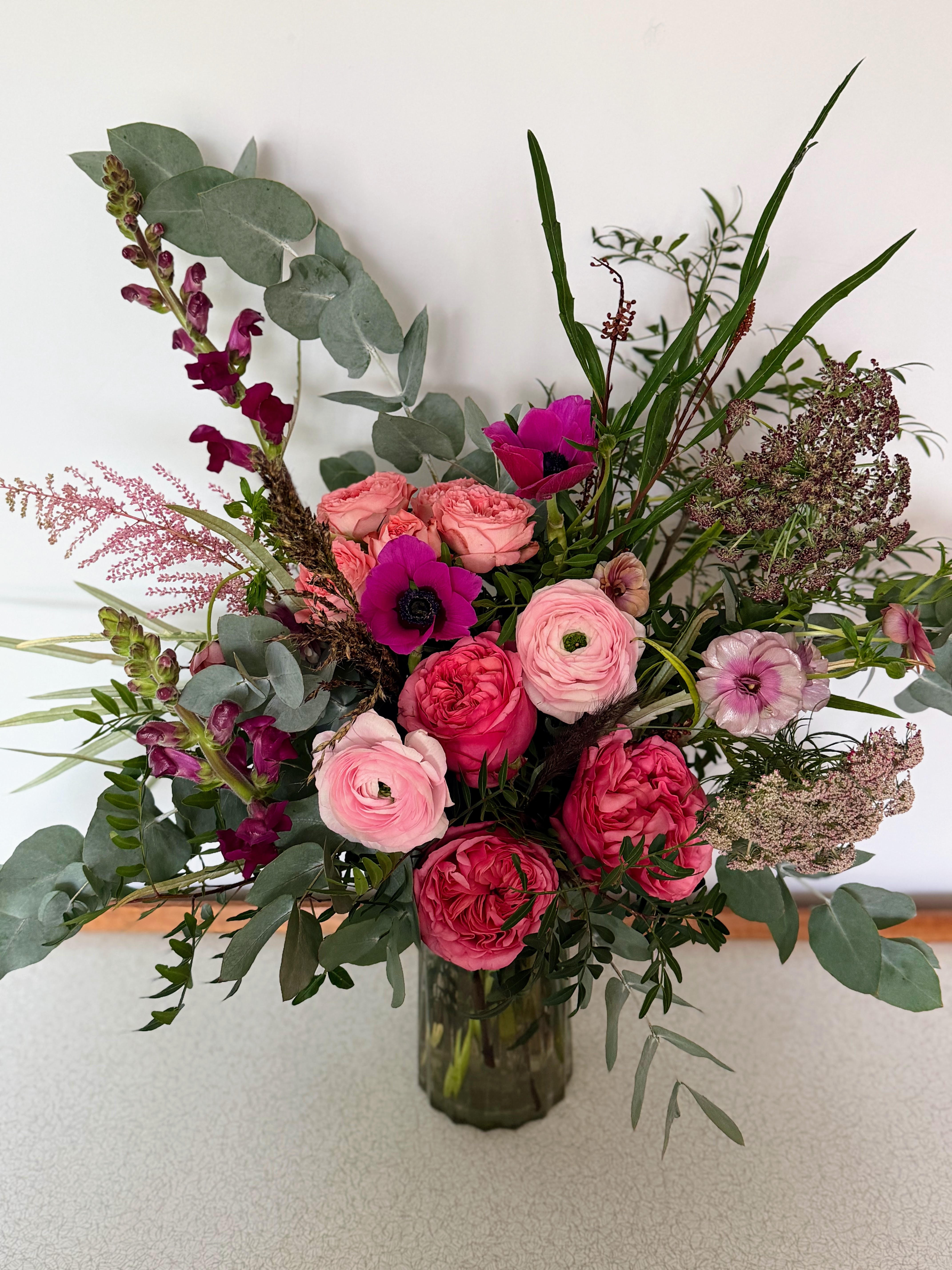 A bold and abundant arrangement bursting with layered roses, ranunculus and striking magenta accents, designed to make a statement and feel luxuriously full from every angle.